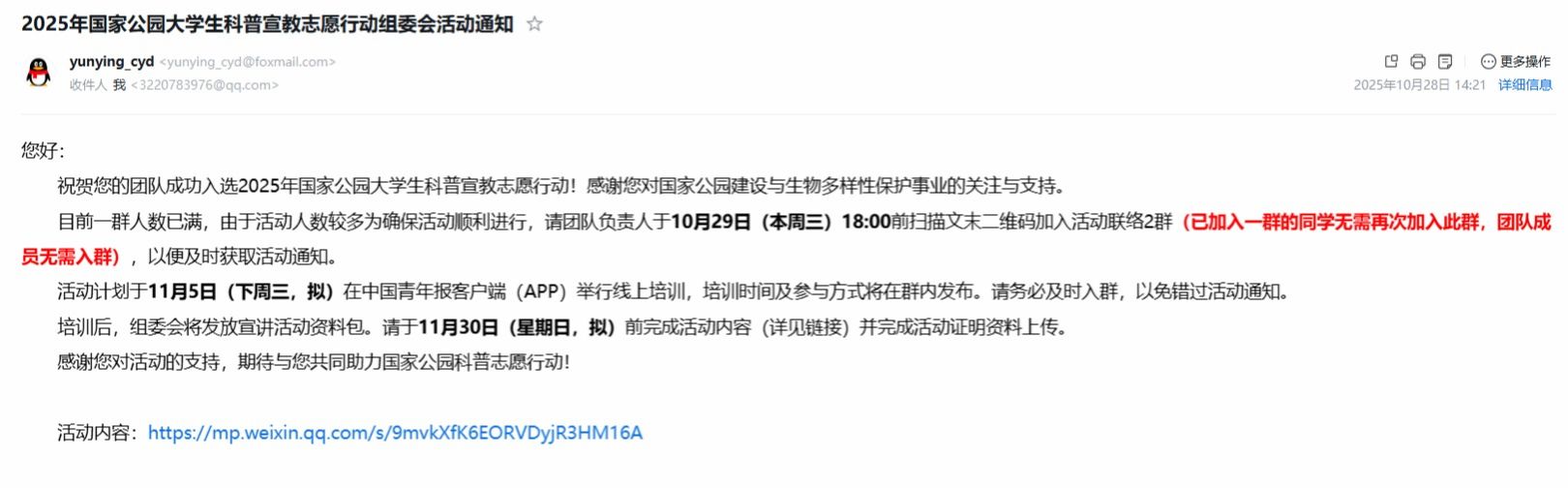 10月28日,2025年全国大学生国家公园科普宣教志愿宣讲团入选名单揭晓,beat365人工智能学院“青铜树”志愿服务队凭借扎实的前期基础和优异的申报方案,成功再次入选。这是该团队继2024年入选后,连续第二年承担此项国家级志愿宣讲任务。