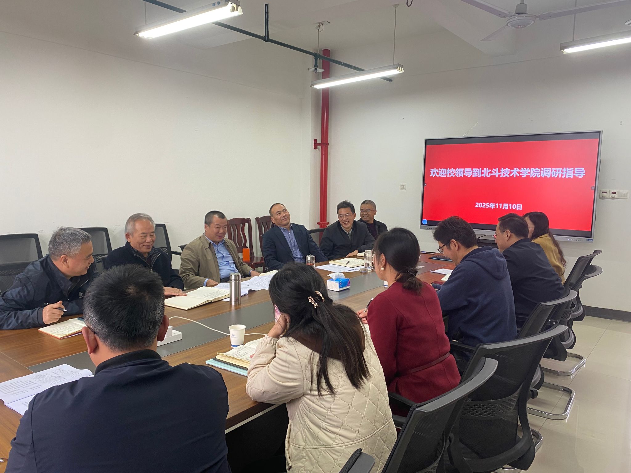 11月10日下午,学校党委书记马大奎、校长杨道远、副校长刘文胜一行赴北斗技术学院调研。本次调研聚焦学院“十四五”规划完成情况与“十五五”规划思路,为学院把脉问诊,指导未来发展方向。调研会由副校长刘文胜主持,党办、教师工作部、科研处、教务处等部门负责人参与调研。