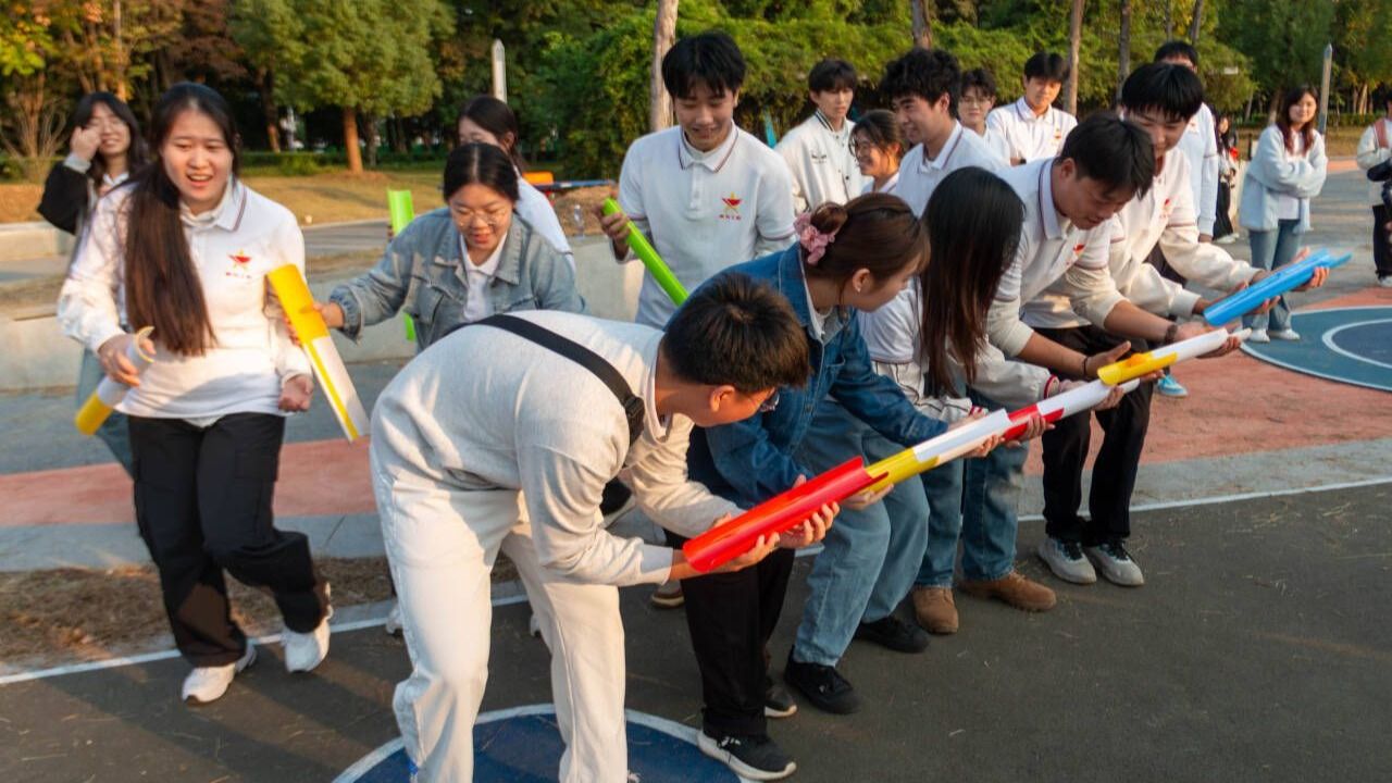 在志愿服务环节中,学员们热情饱满、分工协作,手持清洁工具对园区内的纸屑、包装袋等废弃物进行了细致清理,并对休息长椅、指示牌等公共设施进行了全面擦拭。同时,在公园主入口等人流密集区域,学员们主动开展文明引导服务,以真诚的微笑和耐心的指引,充分展现了青马学员服务社会的奉献意识和昂扬向上的青春风貌。随后的素质拓展环节将现场气氛推向高潮。全体学员分为六个小组,依次参与了“乒乓球传球”“不倒森林”“气球炸弹”等多项需要密切配合的团队游戏。活动中,队员们全神贯注、默契协作,既有紧张激烈的策略讨论,也有失误时的相互鼓励与欢声笑语。各小组在互动中深化了解,在配合中凝聚共识,充分彰显了团队合作的力量与温度。