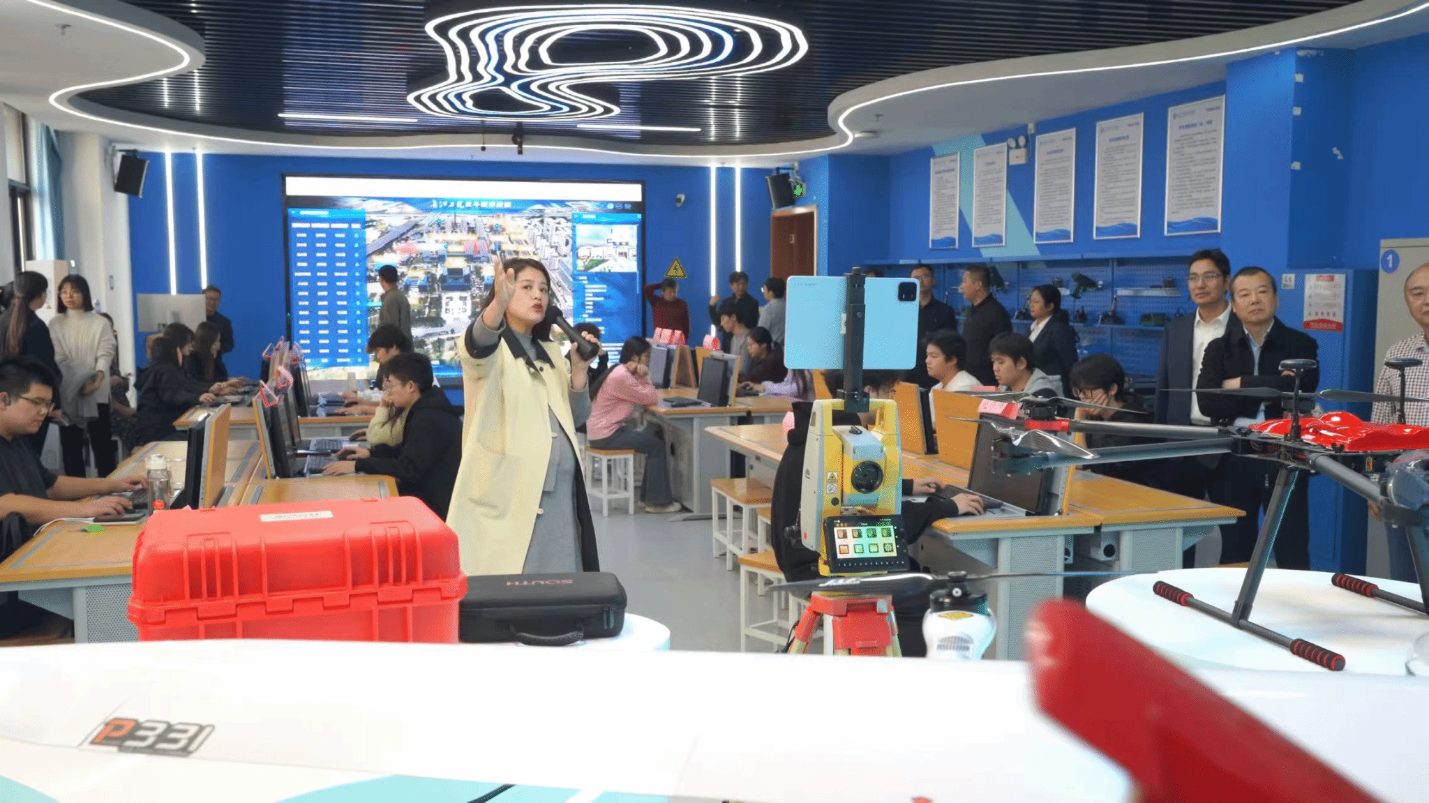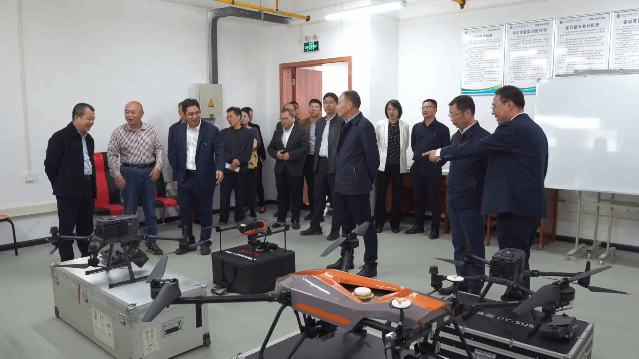 观摩团最后一站来到智能测绘综合实训室,在这里大家参观了无人机、三维激光扫描仪、无人船等先进地理信息设备,赵赛男老师向大家展示了北斗农机平台和北斗校园智慧管理平台,全面展现了学院在实训条件建设、科研服务行业发展方面的责任担当。