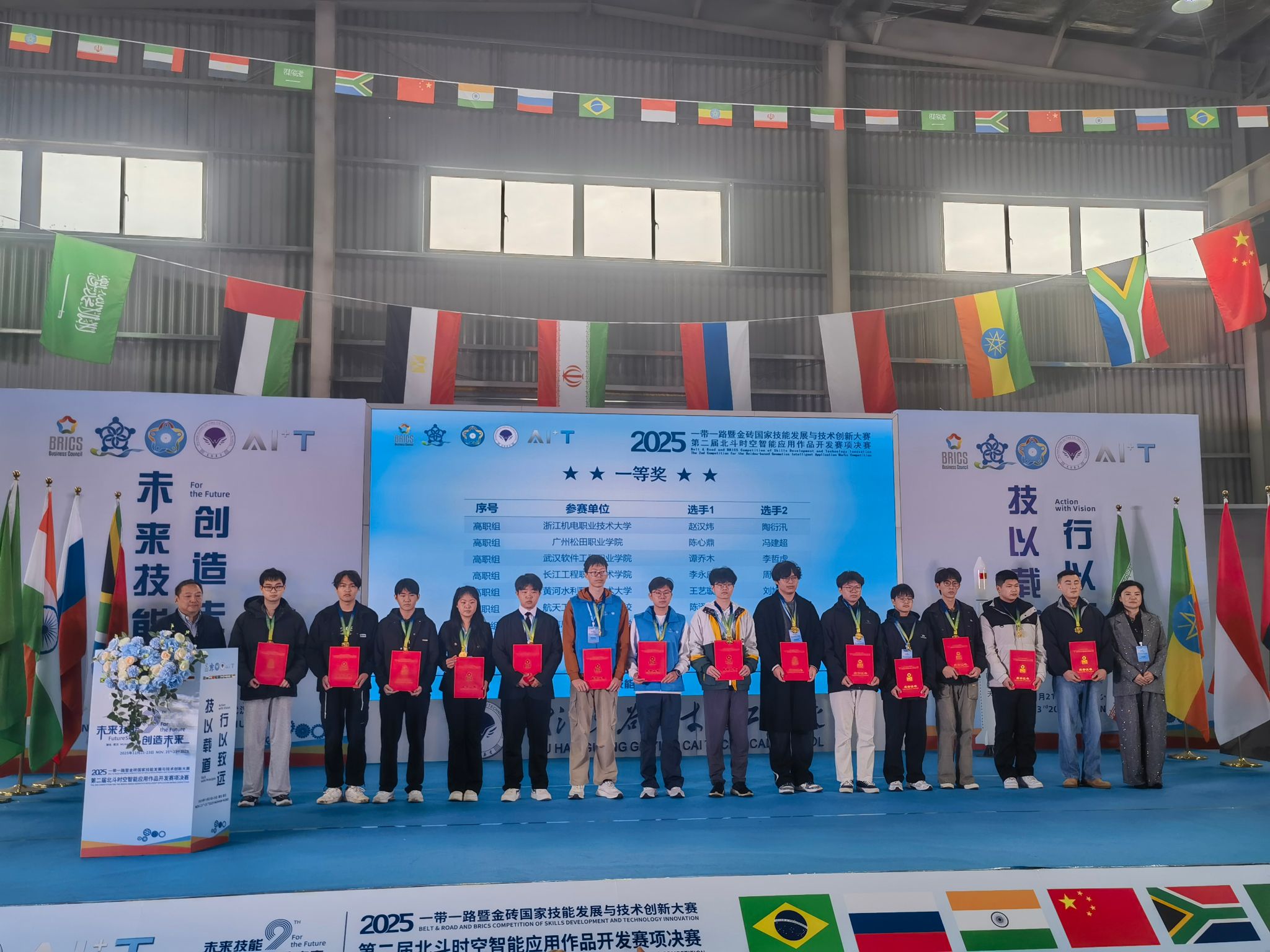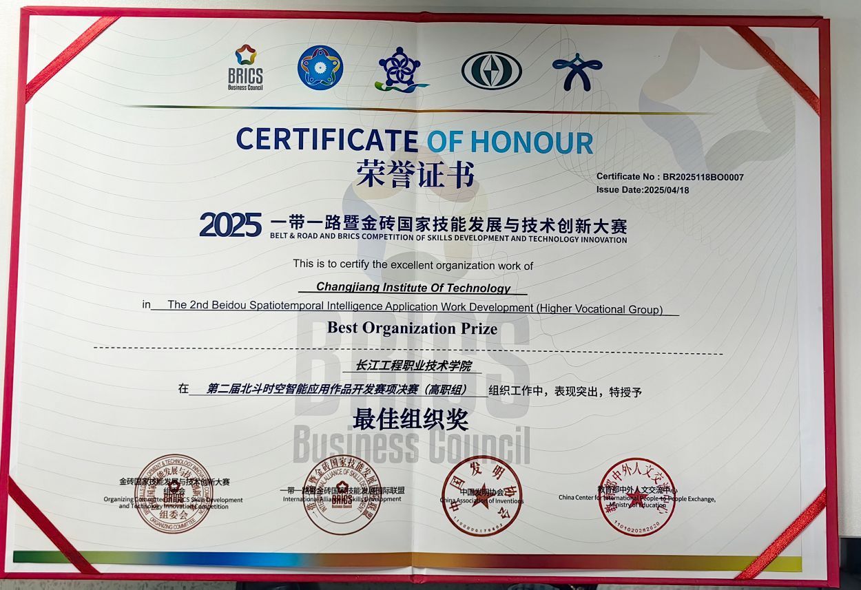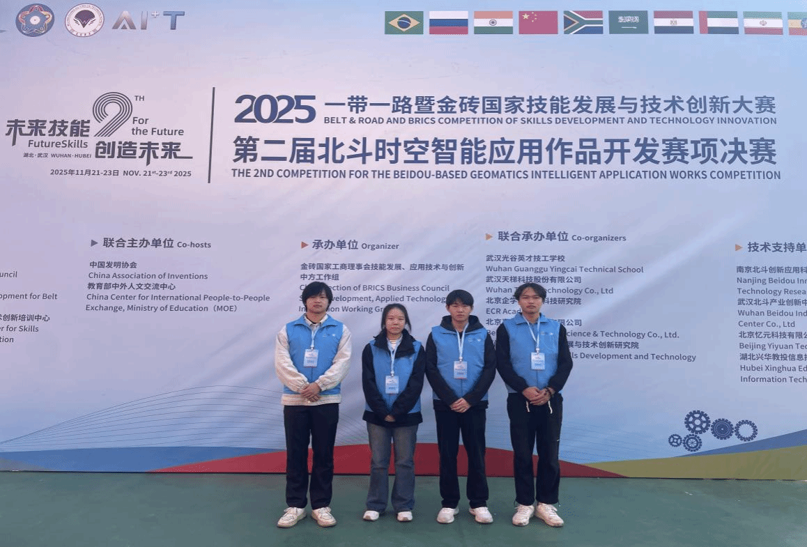 11月22日,2025一带一路暨金砖国家技能发展与技术创新大赛第二届北斗时空智能应用作品开发赛项全国总决赛在武汉举行。人工智能学院閤大海、屈海华、项伟、祝婕组成的教师团队,指导学生李永康、周宇阳和龚柏林、黄倩组成的两支参赛队伍,在激烈角逐中脱颖而出,凭借创新的设计和扎实的技能,最终荣获全国一等奖一项、三等奖一项的优异成绩。同时,閤大海和屈海华两位老师荣获“优秀指导老师”称号,beat365因出色的组织工作被大赛组委会授予“最佳组织奖”称号,实现了比赛成绩与精神文明的双丰收。