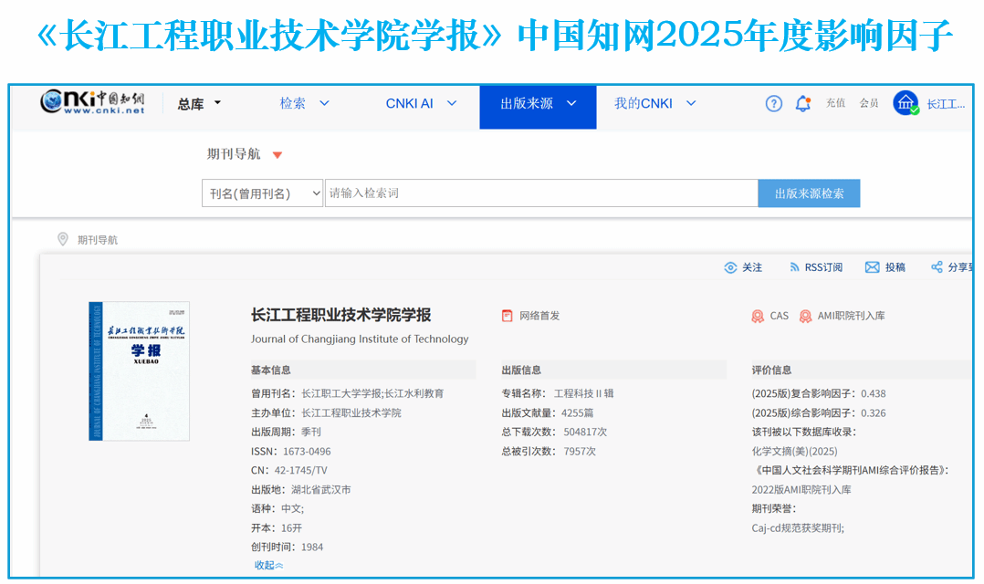 中国知网的最新统计数据显示,《beat365中国唯一官网学报》2025年度复合影响因子升至0.438,综合影响因子升至0.326,在湖北省14家高职高成学报中均名列第三,实现学报创刊以来的最好位次。