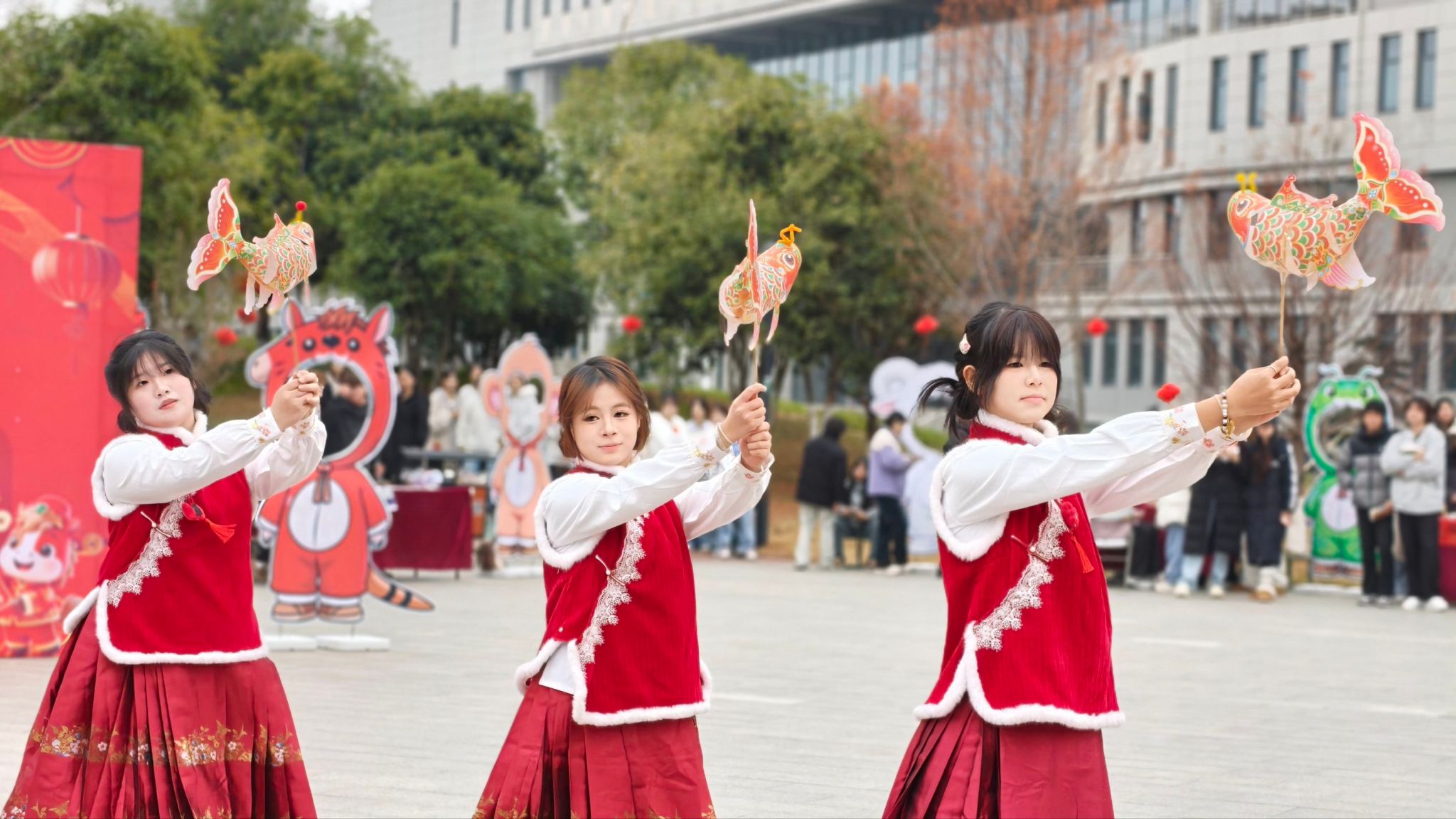 灵动的鱼灯舞翩跹而至,光影交错间尽显传统民俗之美;鼓与舞蹈《双面燕洵》以刚劲鼓点搭配优美舞姿,刚柔并济的表演诠释着奋进力量;子衿国社的汉服走秀古韵盎然,身着各式汉服的学子款款走来,尽显中华服饰之美;群舞《新年快乐》活力四射,欢快的舞步点燃全场热情,老师与学生们一同挥舞双手,跟着节奏喝彩,纷纷拿出手机记录这欢乐瞬间。