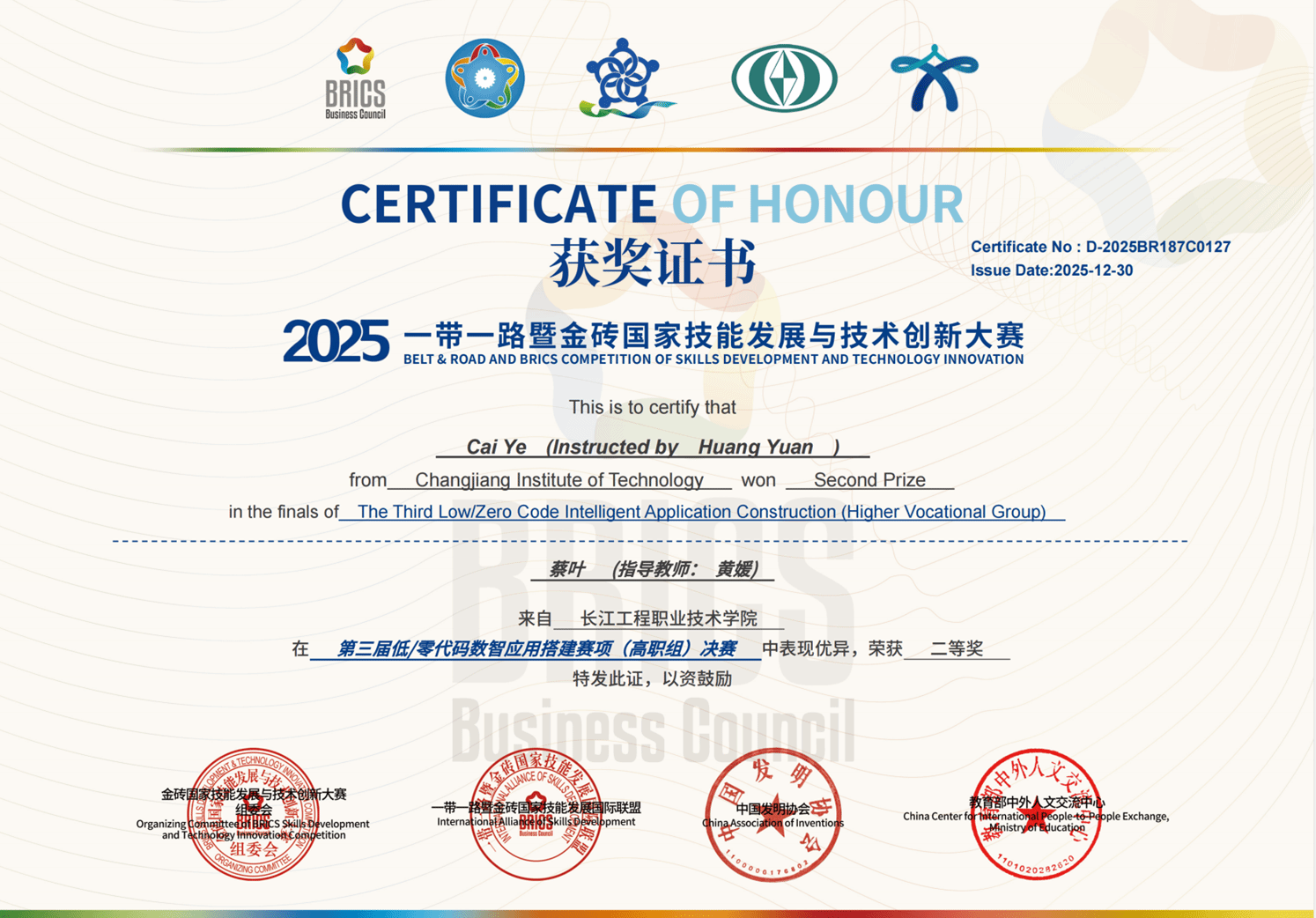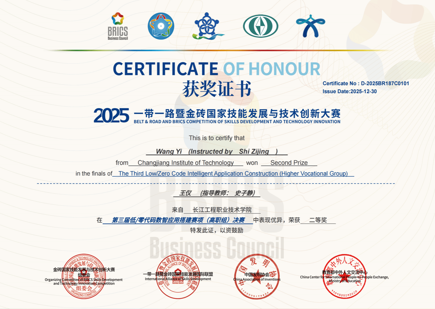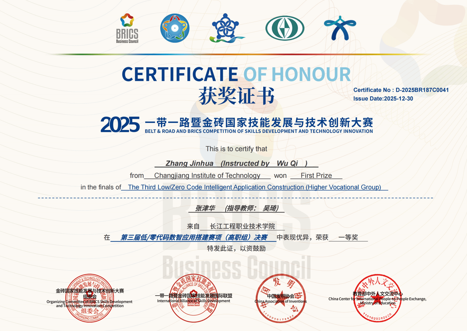 近日,2025年“一带一路”暨金砖国家技能发展与技术创新大赛之第三届低/零代码数智应用搭建赛项决赛圆满收官。人工智能学院凭借“产教融合、精准育人”的鲜明特色,在全国114所高职院校1152支队伍、37所本科院校510支队伍的激烈角逐中脱颖而出,斩获1项一等奖、4项二等奖、4项三等奖,学校获评最佳组织奖,吴琦、黄媛、何毅平、史子静4名教师荣获优秀指导教师称号,用亮眼成绩彰显了beat365在人工智能与大数据领域人才培养领域的坚实根基与显著优势。