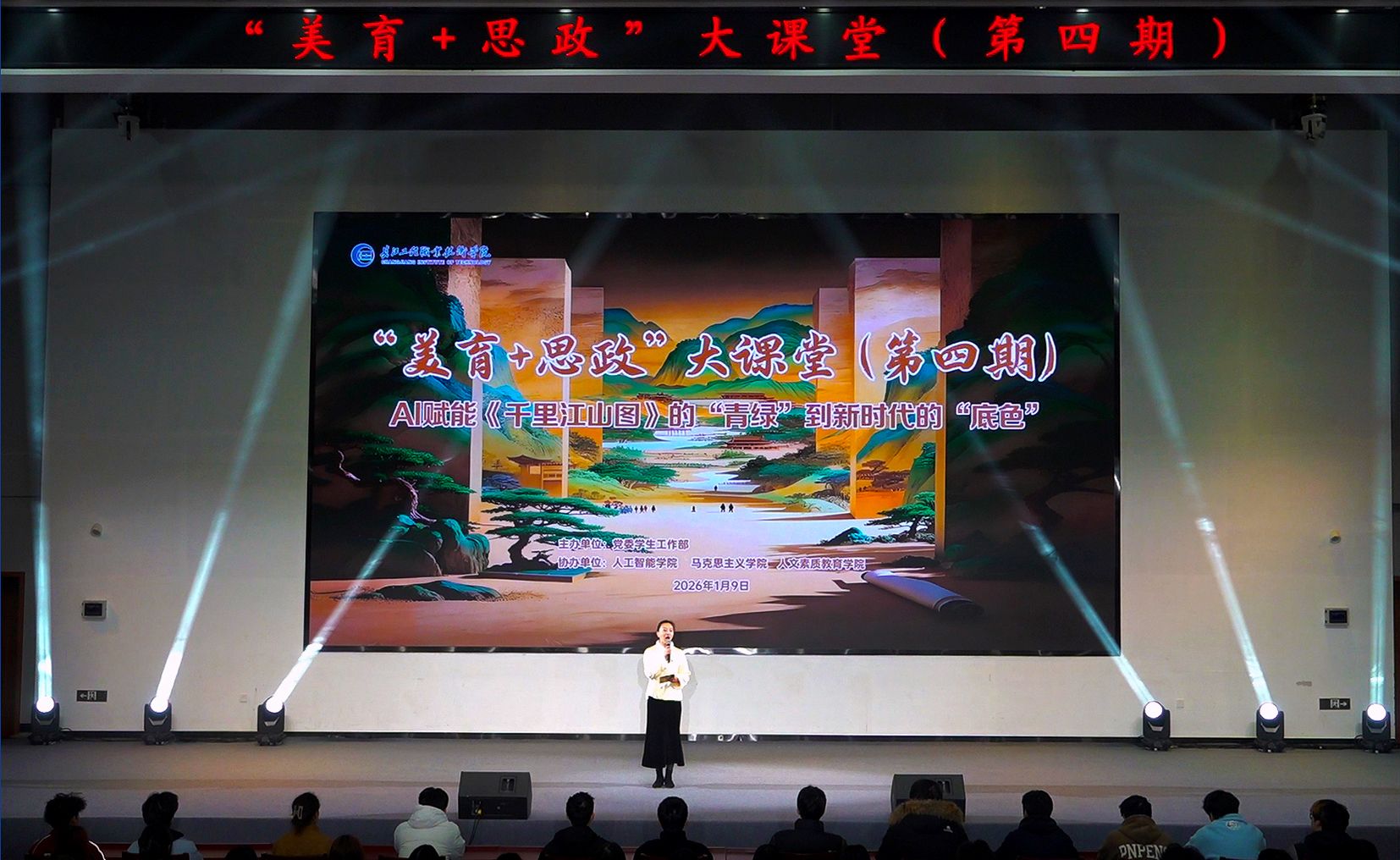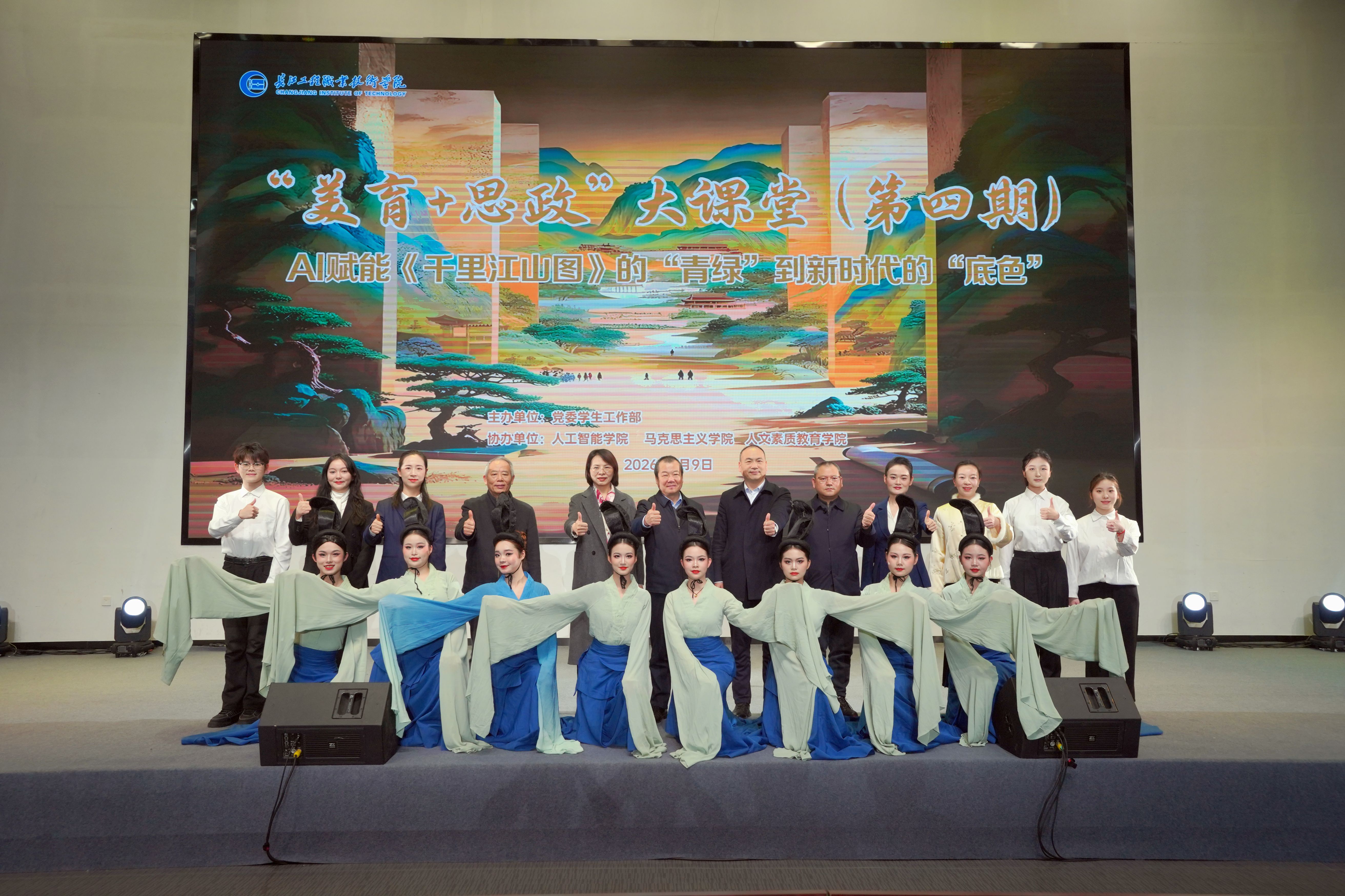1月9日,由党委学生工作部主办、人工智能学院联合马克思主义学院、人文素质教育学院协办的“美育+思政”大课堂(第四期)——《AI赋能〈千里江山图〉的“青绿”到新时代的“底色”》在问渠厅开讲。全体校领导与500名师生代表齐聚,通过数字人互动、学生实践展示、师生AI互动创作、舞蹈演绎等创新形式,对话北宋艺术经典,深化美育熏陶与思政引领。