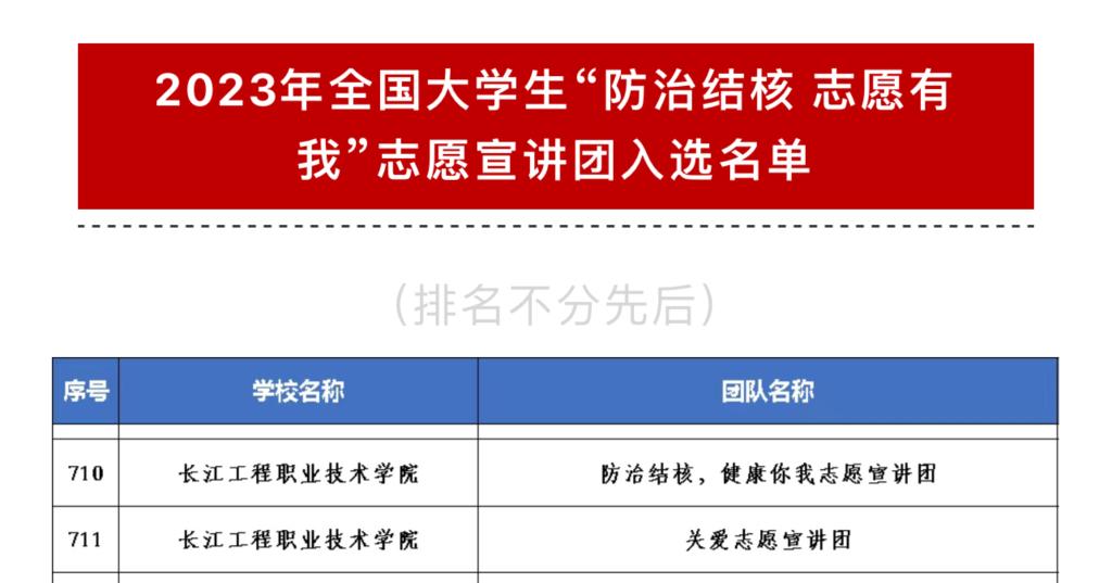 近日,2023年全国大学生“防治结核 志愿有我”精神志愿宣讲团入选团队名单公布,beat365推荐的机电工程学院“关爱志愿服务宣讲团”和“‘防治结核、健康你我’志愿宣讲团”入围。
