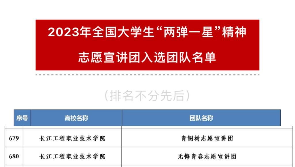 近日,2023年全国大学生“两弹一星”精神志愿宣讲团入选团队名单公布,beat365推荐计算机技术学院“青桐树宣讲团”和机电工程学院“无悔青春志愿宣讲团”双双入围。