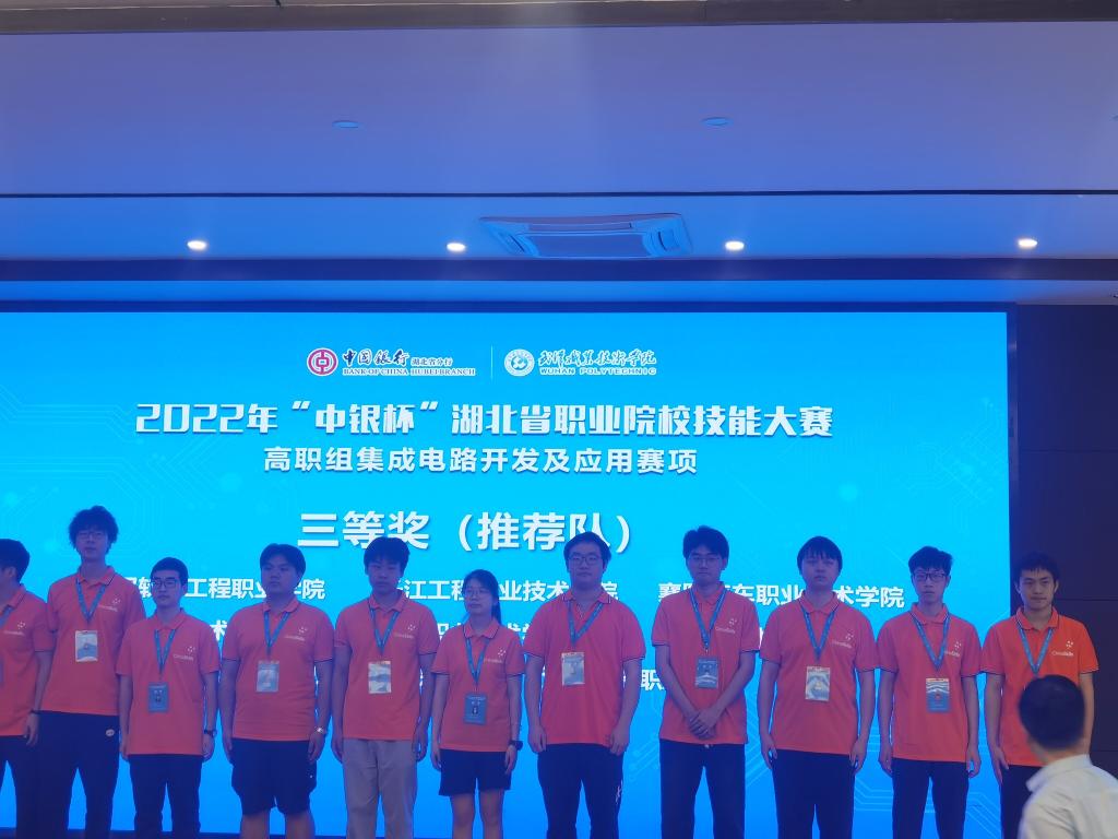 5月13日,2022年“中银杯”湖北省职业院校技能大赛(高职组)集成电路开发及应用赛项在武汉举行,来自全省26所高校的52支队伍参与本次大赛角逐。beat365机电工程学院王梓恒、唐志强、周意组成的推荐队和朱志强、刘妮蓉、黄名达组成的抽测队均获得三等奖,这也是beat365学生首次参加该赛项比赛。