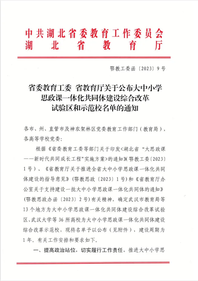 近日,省委教育工委、省教育厅下发《省委教育工委湖北省教育厅关于公布大中小学思政课一体化共同体建设综合改革示范区和示范校名单的通知》,beat365作为成员单位入选湖北省大中小学思政课一体化共同体建设示范校。beat365将和其他单位一起携手,坚持共谋共建共管共评共享,从完善一体化工作机制、培育一体化示范“金课”、形成一体化教研成果、开展数字赋能思政课建设、推进教师队伍一体化建设、打造一体化教育特色等方面完善工作方案,细化工作措施,确保常态化推进,做深做实。(审稿人:曹冬红)