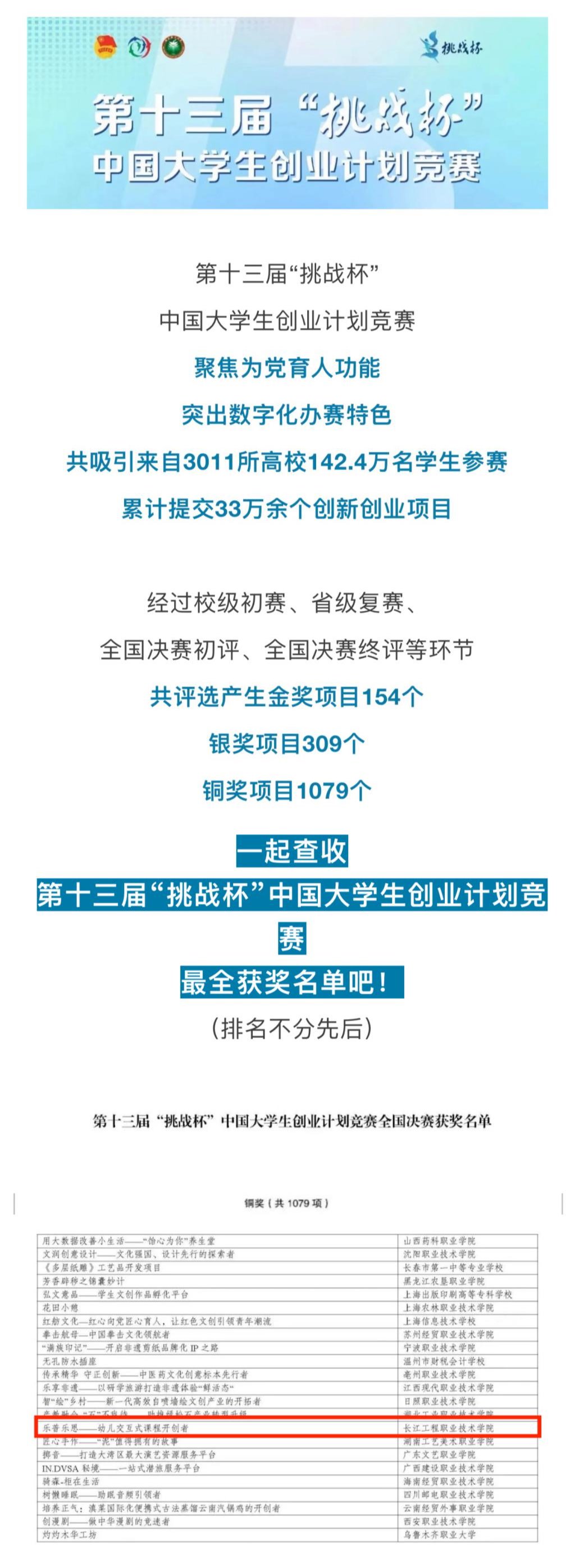 据悉,本届大赛共吸引来自3011所高校142.4万名学生参赛,累计提交33万余个创新创业项目,经过校级初赛、省级复赛、全国决赛初评、全国决赛终评等环节共评选产生金奖项目154个、银奖项目309个、铜奖项目1079个。(审核人:杜捷涌)