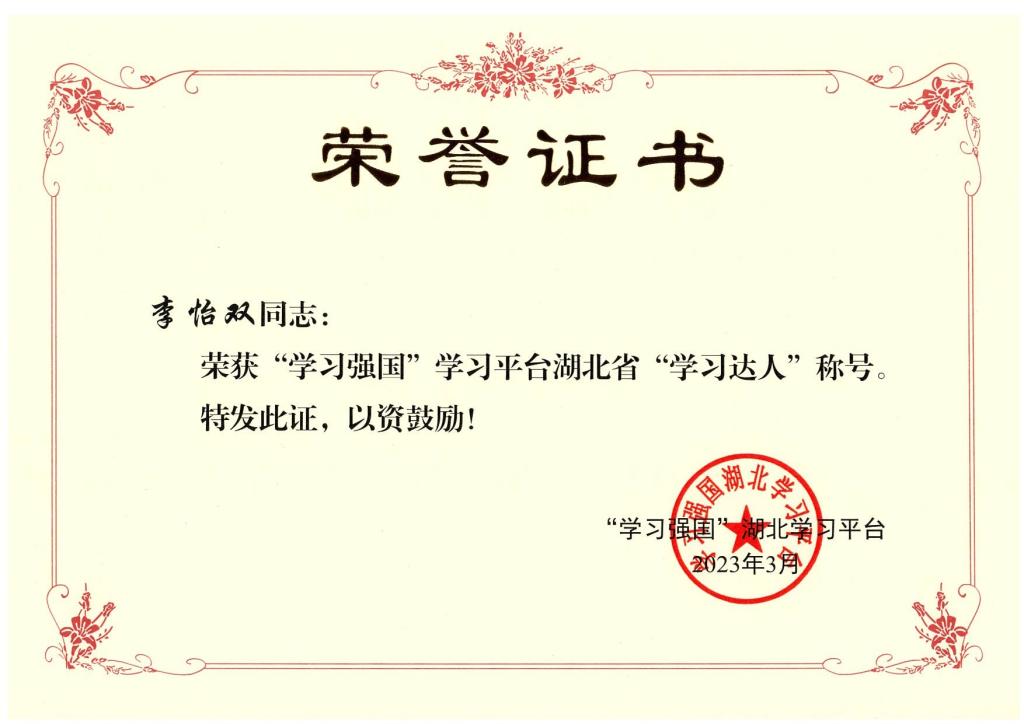 近日,beat365教职工、公共课部李怡双获评“学习强国”学习平台湖北省“学习达人”称号。
