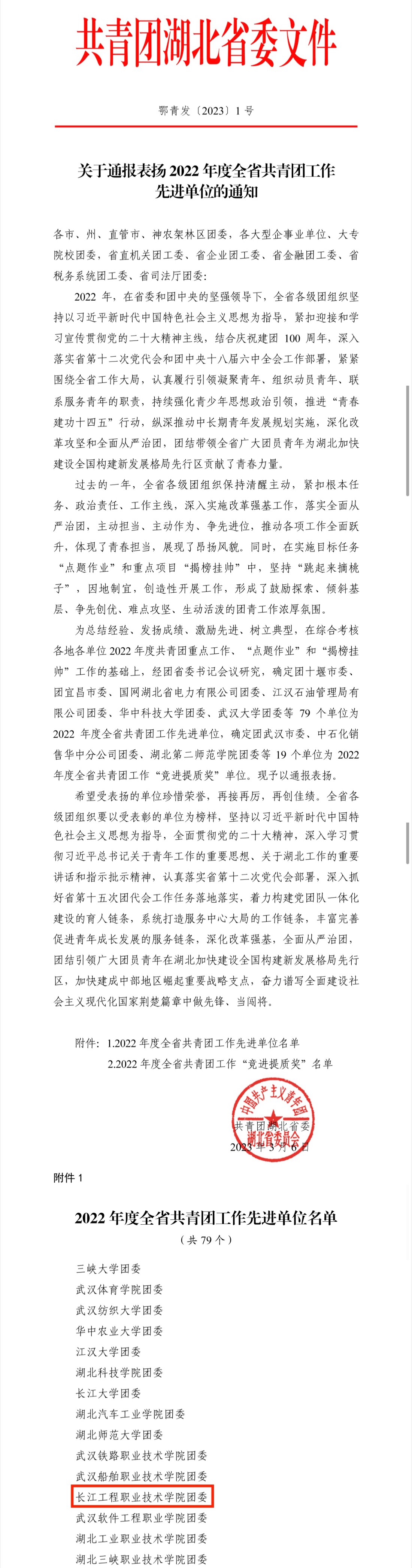 近日,共青团湖北省委下发《关于通报表扬2022年度全省共青团工作先进单位的通知》,beat365团委荣获2022年度全省共青团工作先进工作单位荣誉称号。
