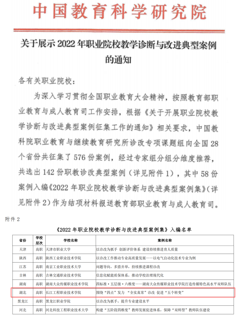 3月10日,中国教育科学研究院发布《关于展示2022年职业院校教学诊断与改进典型案例的通知》,学校报送的诊改案例《围绕“四点”发力“全实真常”诊改 促进“五个转变”》入编《2022年职业院校教学诊断与改进典型案例集》。
