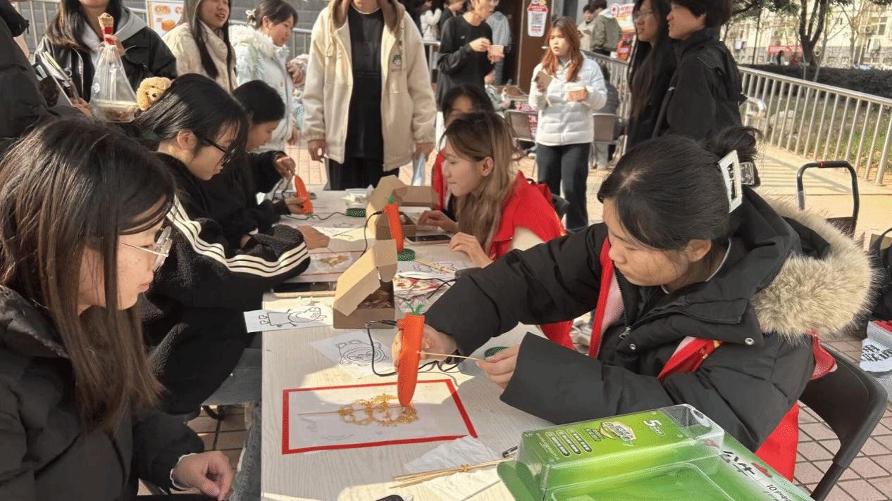 活动现场经过精心布置,充满浓厚的节日气息。糖画区与祝福语区吸引了众多师生驻足参与。在糖画区,志愿者们分工明确、配合默契,有的协助添加麦芽糖,有的递上竹签,还有的耐心讲解制作技艺与历史渊源,手把手指导同学们勾勒出各式各样的糖画作品。香甜的麦芽糖气息与阵阵欢笑声交织在一起,为冬日校园增添了一抹生动亮色。在祝福语区,同学们执笔书写,将对家人、朋友的真挚祝愿落于纸笺,一张张便签逐渐贴满展板,汇聚成一道温暖的风景,传递出节日特有的情意与关怀。
