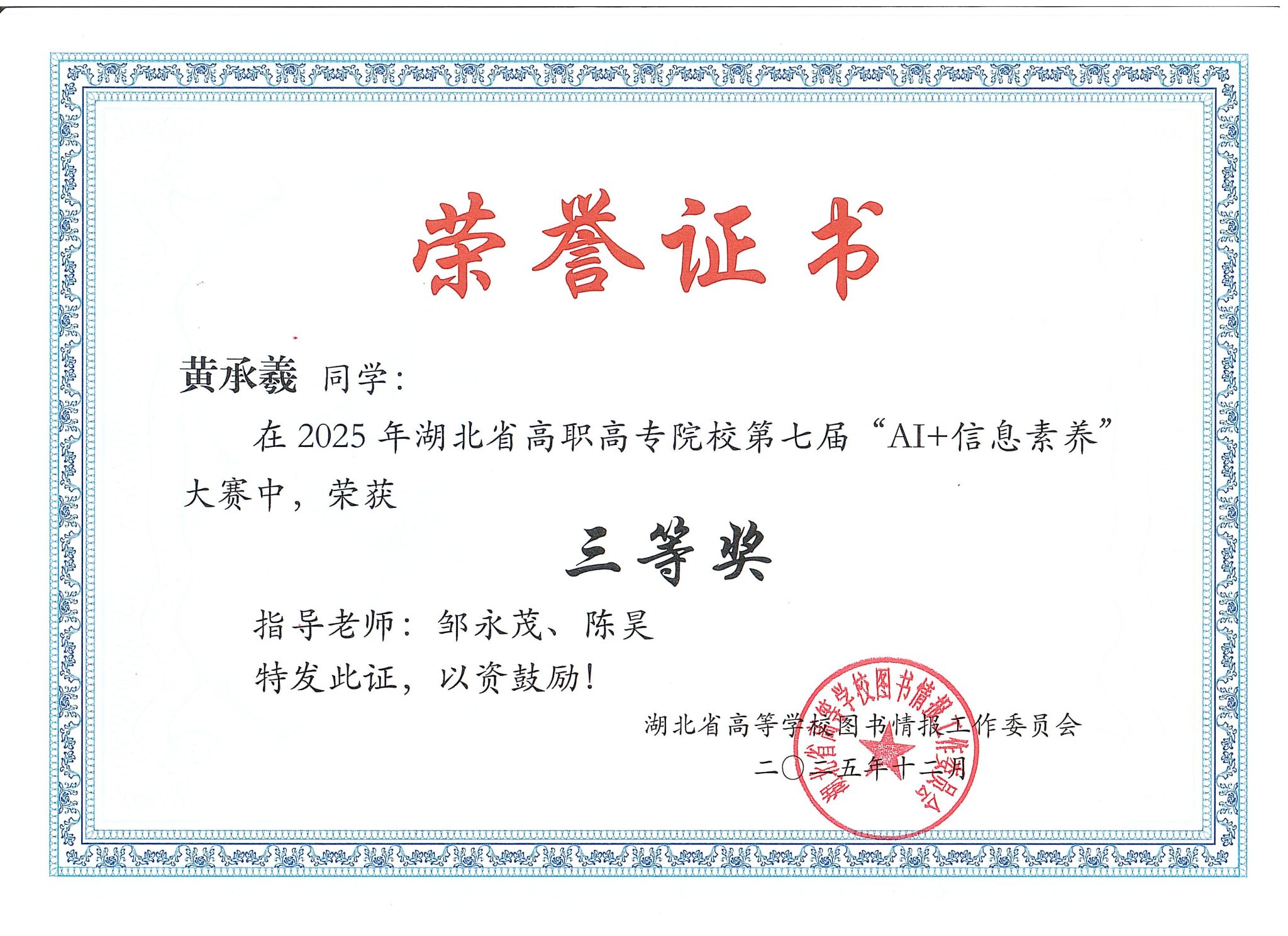 学校图书馆高度重视此项赛事,进行了广泛动员和精心筹备。赛前,图书馆对参赛学生进行了培训和指导,内容涵盖信息检索策略、数据分析工具使用以及AI辅助学习等方面,有效提升了学生的参赛水平和竞争力。经过层层选拔,10名选手脱颖而出,代表学校参加省赛。比赛中,参赛学子沉着应战,灵活运用所学知识与技能,在信息检索、分析与创新应用等环节展现出良好的专业素养和实践能力,人工智能学院软件2402班黄承羲同学获个人三等奖。
