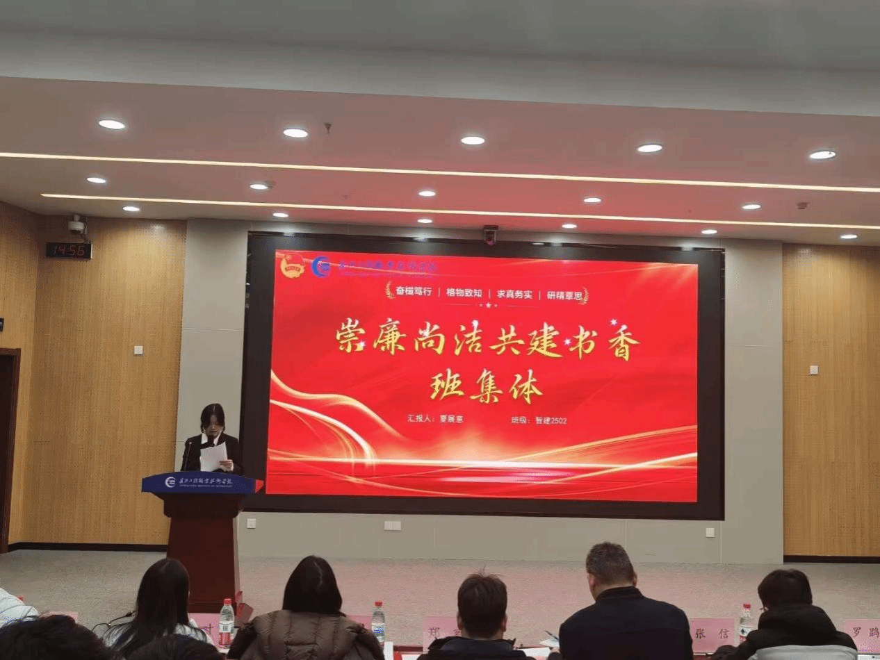 12月24日下午,智能建造学院在长江楼惟勤厅举办2025年度“清廉班级”现场评选活动。省纪委监委驻校纪检监察组、校纪委综合室主任张贤赋、智能建造学院院长郑睿、副院长张信、党总支副书记李俊及全体辅导员老师参与活动。12个优秀班级代表依次上台展示建设成果,展开角逐。