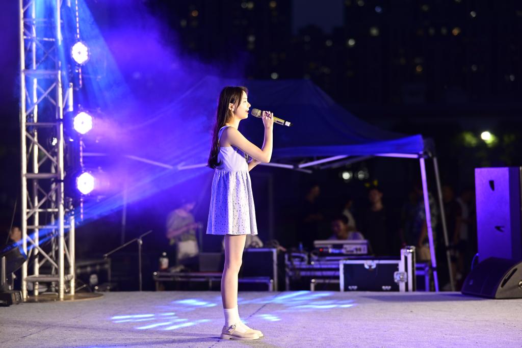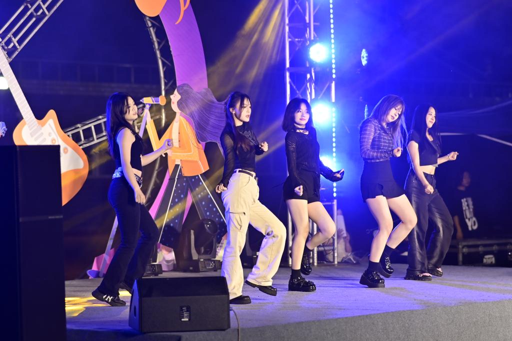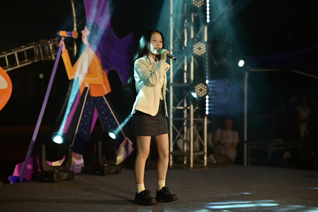 皓月当空,草地与音乐相伴,一首首青春之歌响彻夜空,同学们挥舞荧光棒,身体随音乐摇摆,沉醉其中,青春的热情燃爆整个校园。说唱节目《麒麟》一开场就将现场气氛瞬间点燃,观众纷纷挥舞着手中的荧光棒和手机灯光,跟随演唱节奏一起摇动,《Queencard》《一千个伤心的理由》《身骑白马》《pop》等歌曲带领着大家驰骋在音乐的海洋里。活动最后,还特别邀请到了20级、21级、22级校大学生艺术团团长,带领大家千人合唱了经典歌曲《后来》,让音乐节画上了一个圆满的句号。
