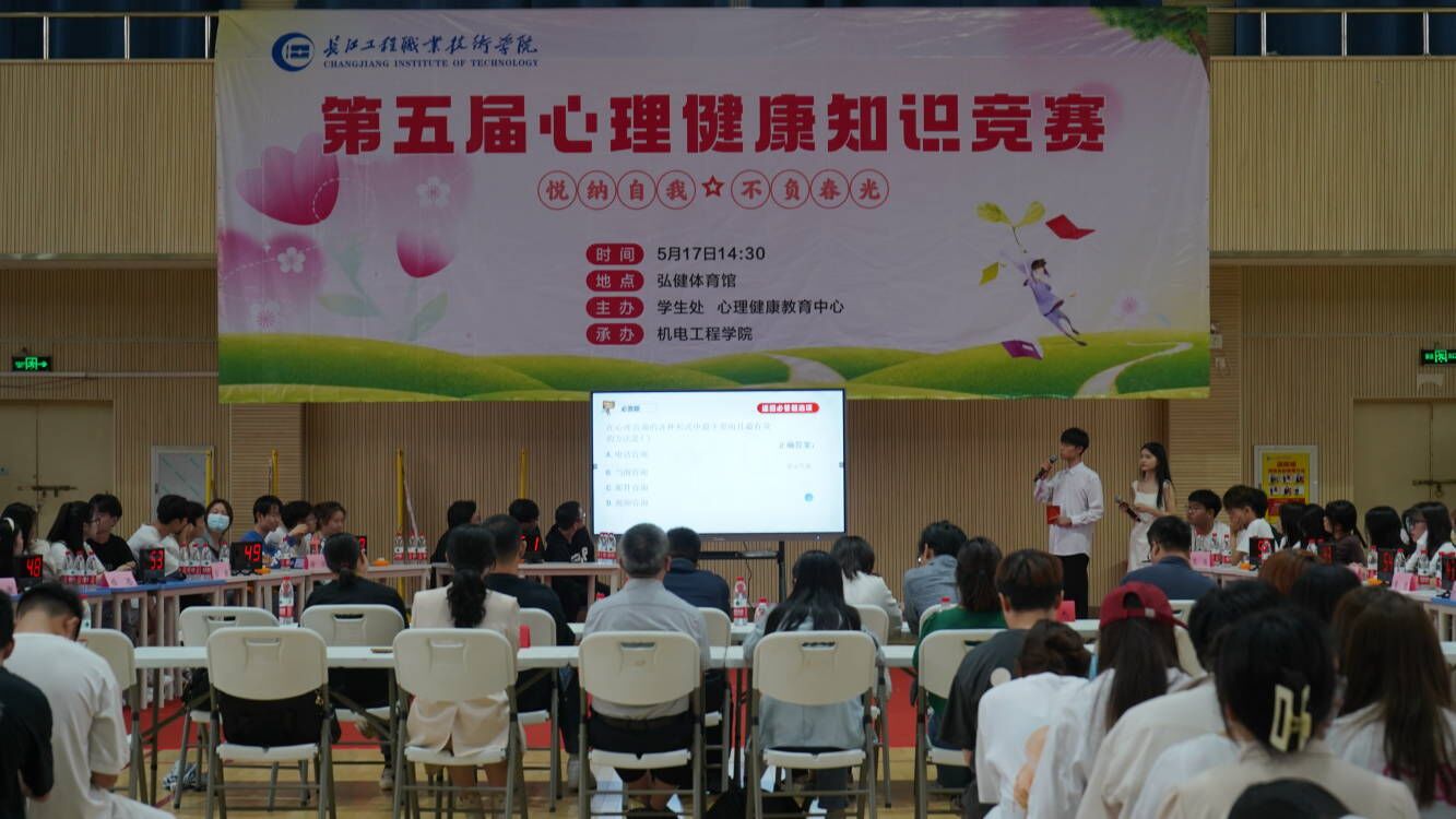 5月17日,“悦纳自我、不负春光”——第五届心理健康知识竞赛在弘健体育馆举行。活动由学生处学生心理健康教育中心主办、机电工程学院承办。计算机技术学院党总支书记汪吉平、机电工程学院党总支书记向云、机电工程学院党总支副书记孙锂婷、学生处心理健康教育中心综合研究室专任教师雷英爽参加了活动。来自二级院校11支参赛队伍参赛。