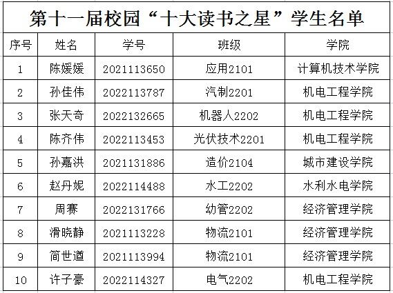 为贯彻落实党的二十大精神,推进中华优秀传统文化全方位融入高校教育,引领大学生自觉增强文化主体意识、坚定文化自信、强化文化担当,做中华优秀传统文化的忠实继承者、弘扬者,图书馆举办了“经典永传承 书香润校园”读书日系列活动,其中评选校园十大“读书之星”是该系列活动之一。