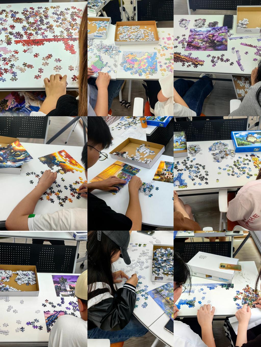 参赛同学两人一组,共拼一副拼图,1000块的拼图,对同学们来说是个不小的挑战,既考验脑力,更考验耐力。活动过程中,各组同学积极开动脑筋,冥思苦想,团结协作,互相帮助,既有“太难了”的感慨,也有找到线索的兴奋与喜悦,现场气氛热闹而温馨。