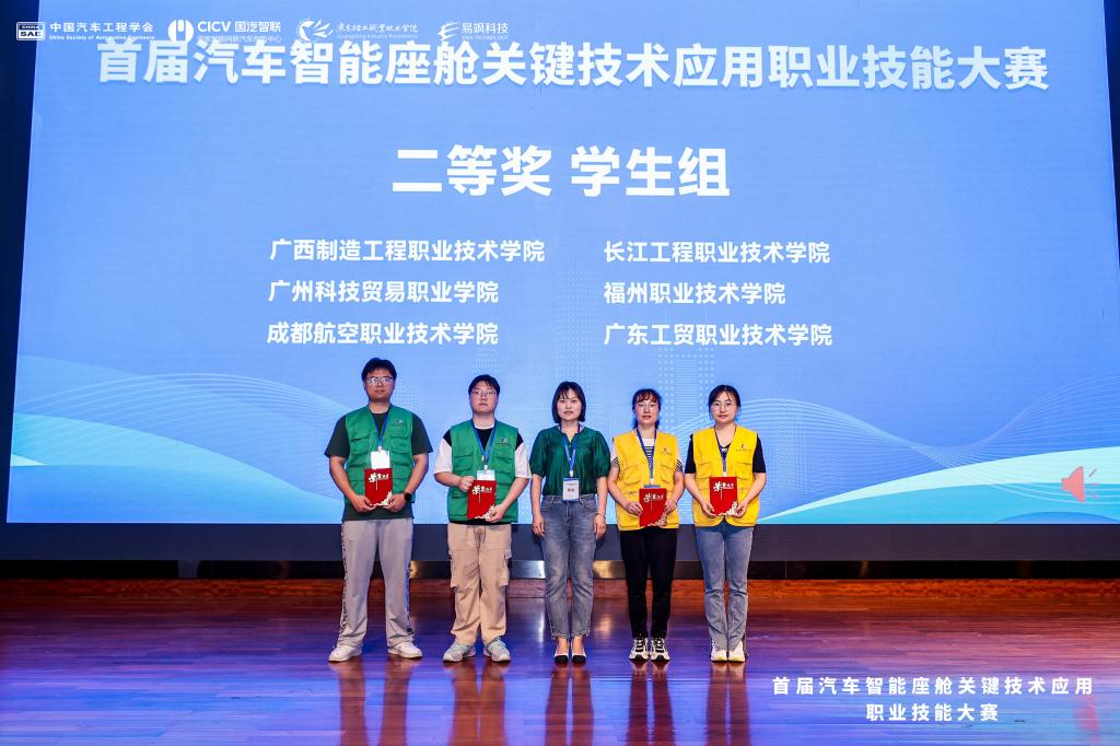 近日,首届汽车智能座舱关键技术应用职业技能大赛在广东省佛山市落下帷幕。beat365学生组(高植樟、郑杨)与教工组(贾佳秀、廖文蓉)在全国五十多组参赛队伍中脱颖而出,均获得二等奖。