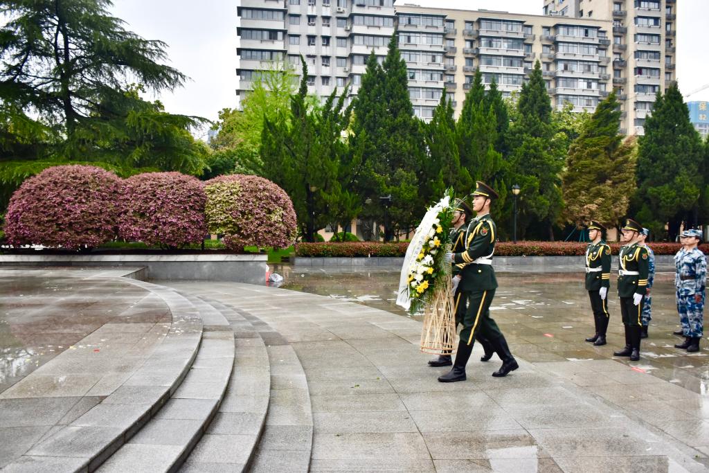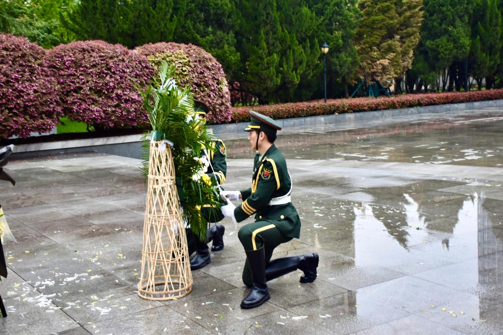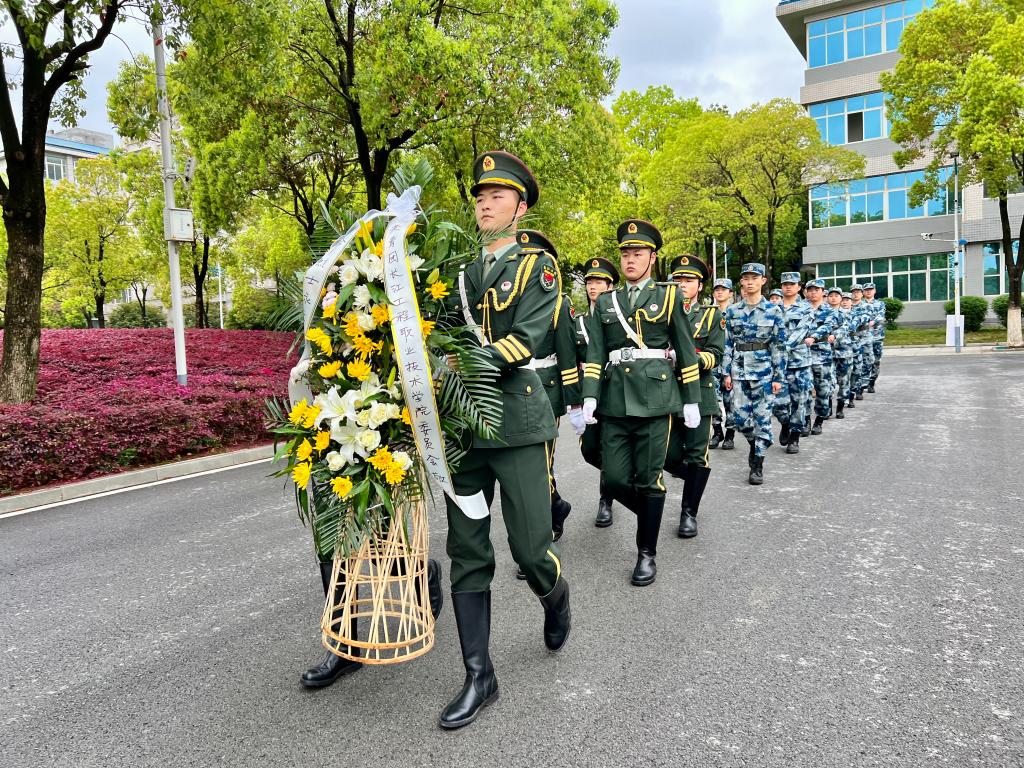 活动伊始,两名国护队队员托起花篮,缓缓走向烈士纪念碑,将花篮整齐摆放在纪念碑基座上。师生排列整齐,面向纪念碑鞠躬,并肃立默哀,对革命烈士和英雄前辈致以崇高的敬意和无尽的怀念。