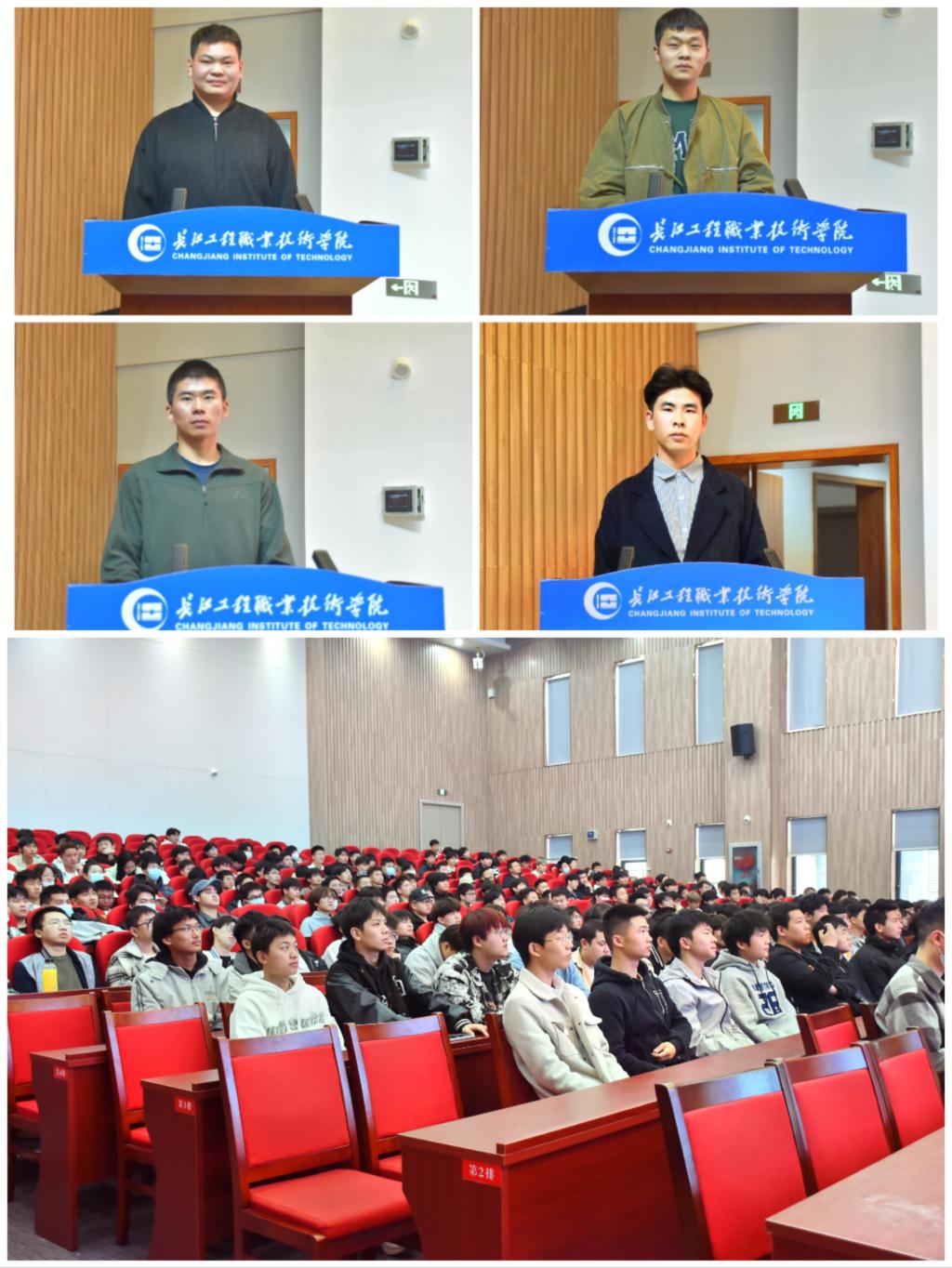 大家观看一系列非常具有感染力的国防教育公开课和征兵宣传片后,各院系优秀退役复学学生代表程正芝、汪天傲、楚昌杰、黄茜茜依次上台讲述自己的入伍经历和成长故事,分享了自己初入军营的不适、训练中的艰辛、执勤中的趣事、收获到的荣誉以及绿色军营里的点点滴滴,他们呼吁有意参军入伍的青年们勇敢迈出军旅生涯的第一步,用满腔热血投身于祖国的国防建设之中。他们挺拔的站姿、洪亮的声音、坚定的眼神,处处彰显出的军人特质,赢得了现场同学们的阵阵掌声。