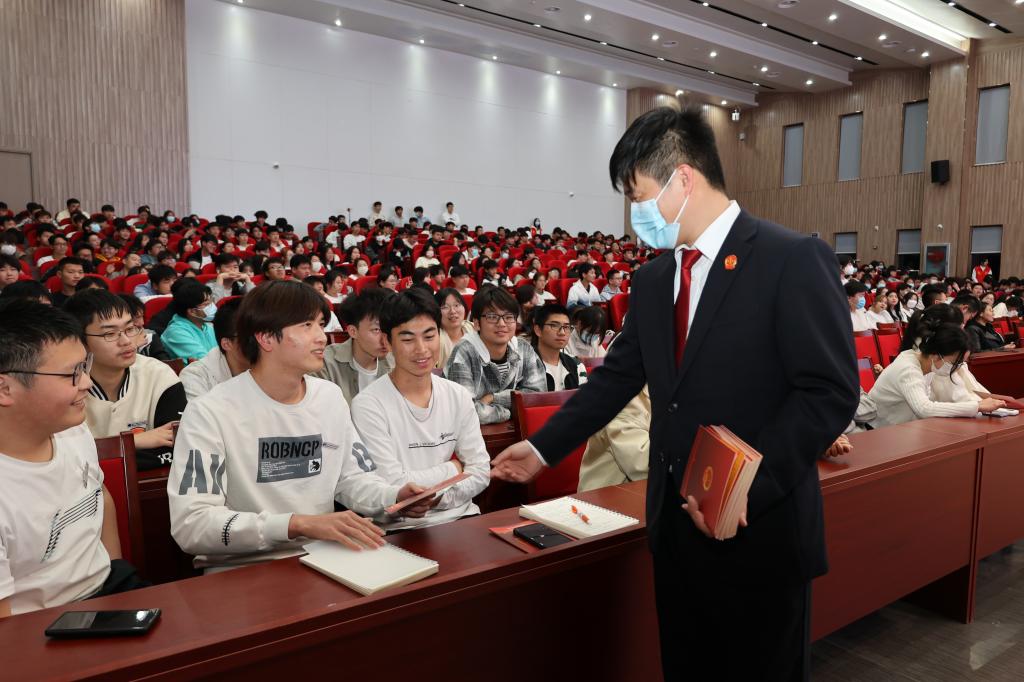 王倩以“在点滴小事中学习民法典“为主题,从 “理发店办卡”、“骑共享单车”、“校内踢球”、“校园恋爱”四个案例讲起,以案释法。王倩以生动的讲解和有趣的互动让学生明白学法、守法、懂法、用法的重要性。她提醒同学要树立法律意识、证据意识,在遇到纠纷时要敢于善于运用法律维护自身的合法权益。在讲座现场,法院工作人员为现场学生释法答惑,为现场师生赠送了民法典宣传册。