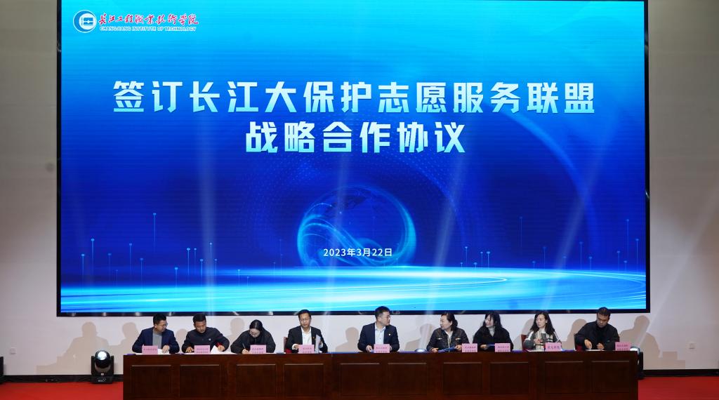 高校代表上台签订了长江大保护志愿服务联盟战略合作协议,宣告长江大保护志愿服务联盟正式成立。
