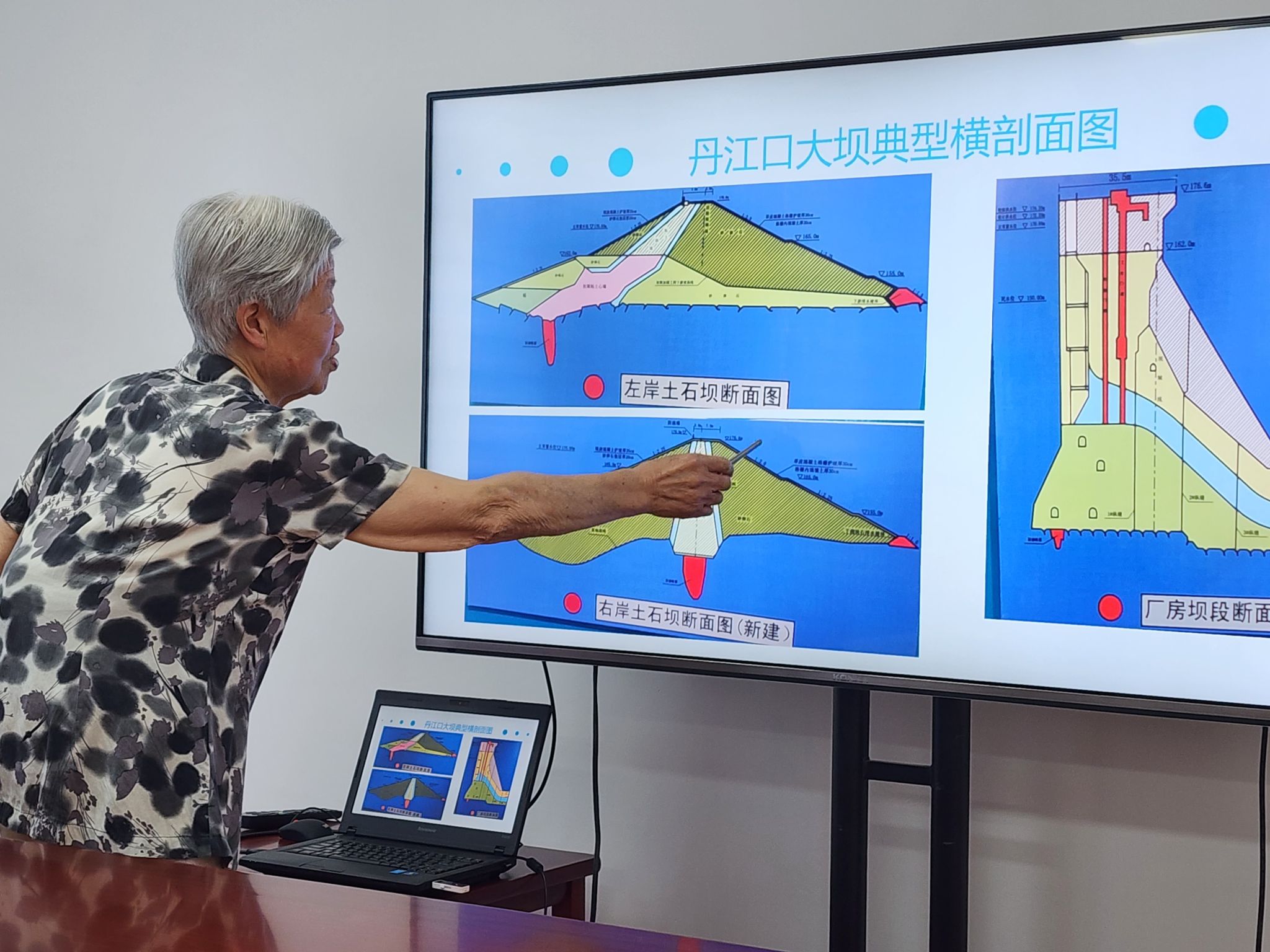 杨小云对向家文一行表示热烈的欢迎,她介绍了丹江口水利枢纽概况、大坝加高工程、丹江口水库征地移民工程和蓄水及供水情况。“丹江口大坝是新中国成立之初自行勘探、设计、施工的大型水利枢纽工程。十万建设大军焚膏继晷、筚路蓝缕,大坝终于在1967年下闸蓄水。此后,大坝在防洪、发电、供水等领域发挥了重要作用……”杨老对丹江口工程每个数字都如数家珍,对丹江口充满深情,在场的每位党员都为之动容。向家文表示,这是一趟怀旧之旅、寻访之旅、开拓之旅,我们要挖掘丹江口等工程所孕育的精神,用来教育培养我们的学生,把水利人的精神传承下去。