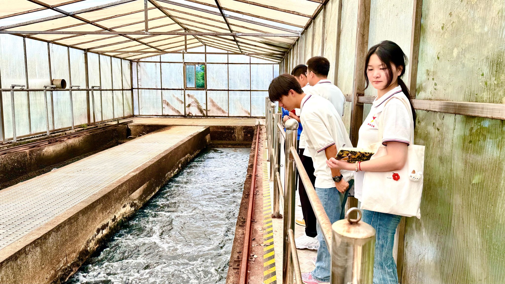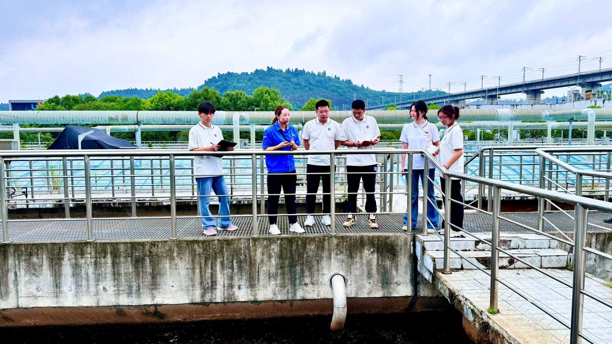 工作人员朱永莉详细介绍了污水处理的工艺和流程,带领师生实地参观了细格棚间、生化池、二沉池、鼓风机房、加药间、除臭间等重要工艺单元。实践团跟随工作人员的步伐,看着污水由最初的黑而臭,逐步处理为合格的可排放入长江的清澈水体,师生们发出了“难怪长江宜昌段水质会越来越好”的感叹。